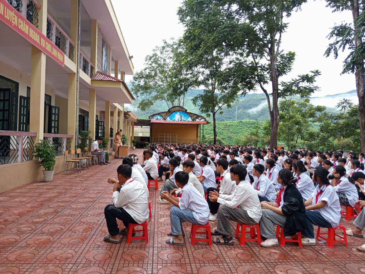 Học sinh chăm chú lắng nghe các chú truyên truyền phổ biến.