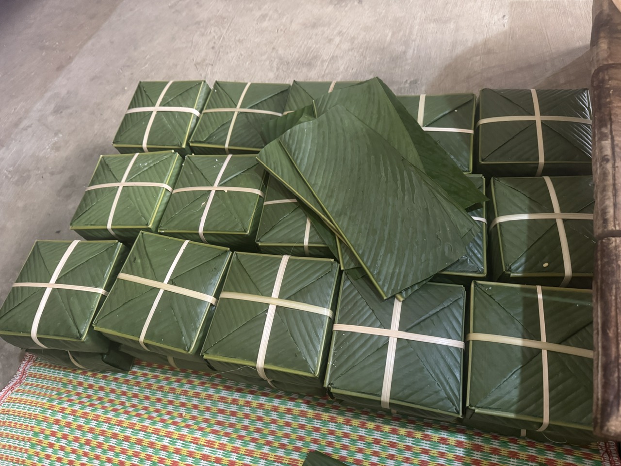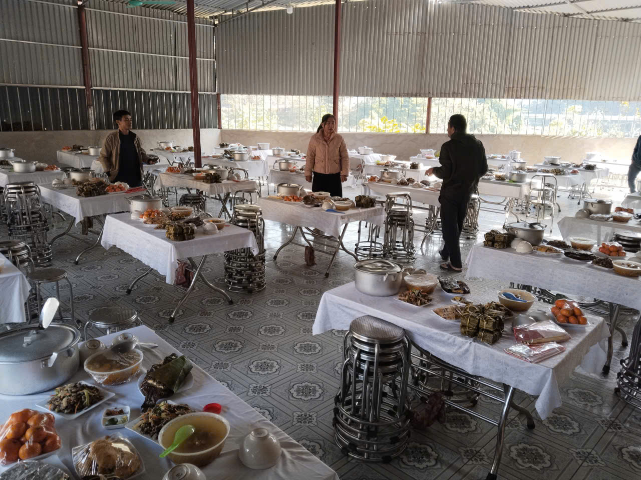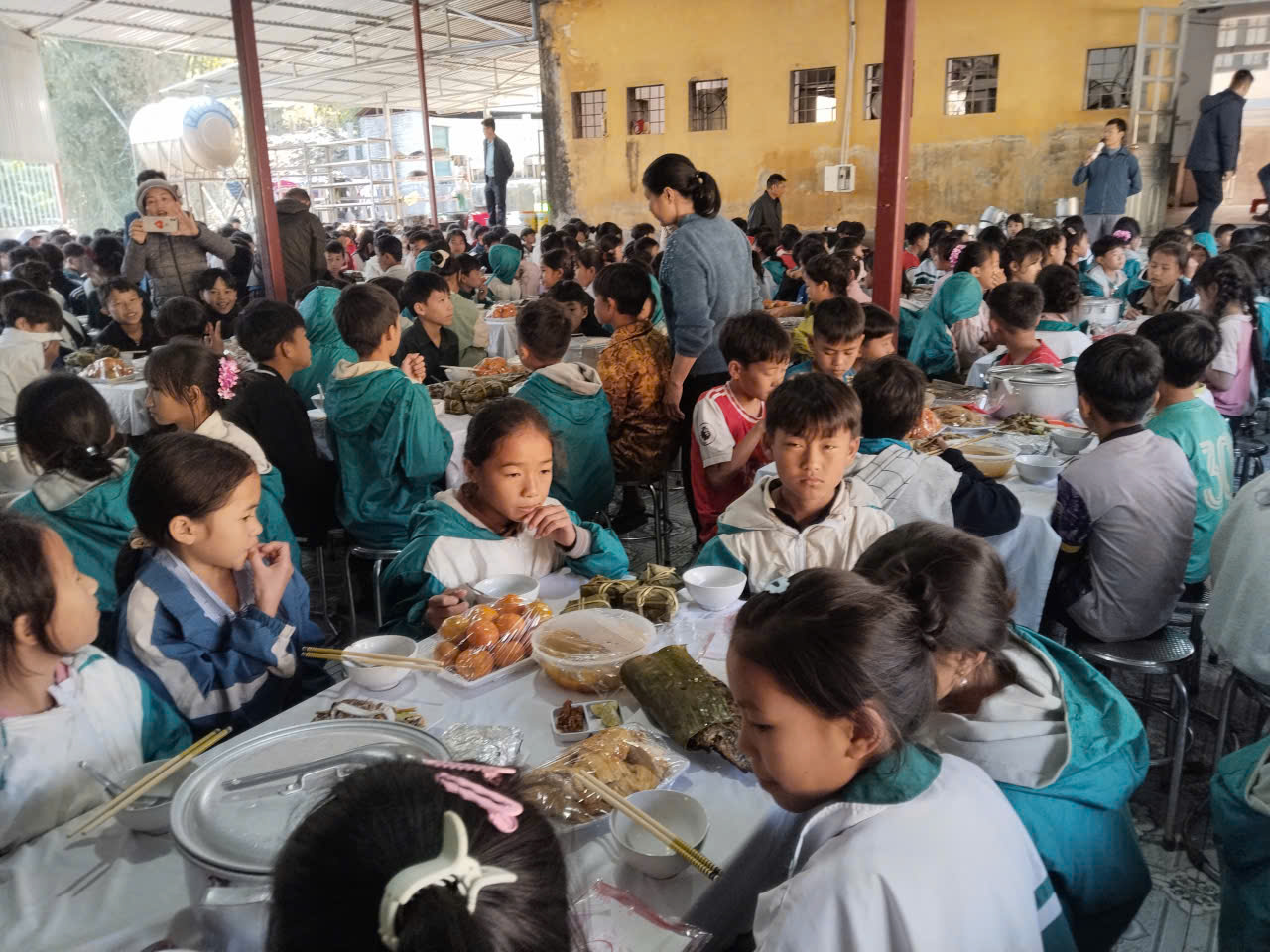Khu vực nhà ăn đã được chuẩn bị tươm tất từ sớm. Trên những chiếc bàn ăn sạch sẽ là những mâm cỗ mang đậm hương vị Tết cổ truyền và đặc sản địa phương. Những chiếc bánh chưng gù xanh mướt, những đĩa quýt vàng ươm, bát canh nóng hổi và những món thịt được chế biến thơm lừng đã sẵn sàng chờ đón các em.
